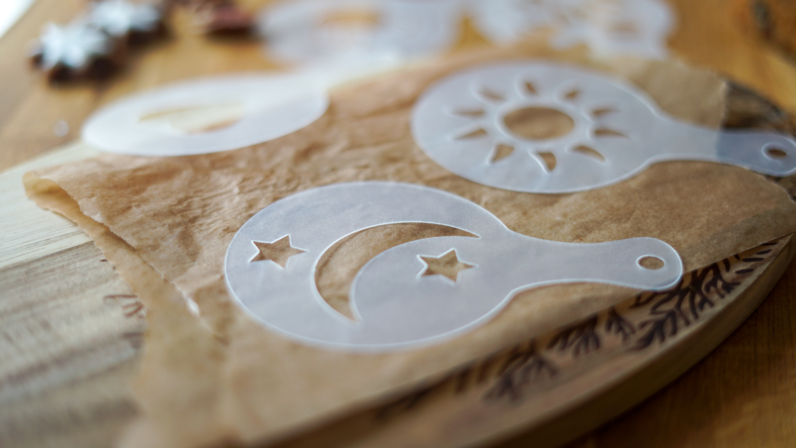 Préparez votre chocolat chaud ou votre cappuccino avec une mousse de lait, disposez votre chablon sur le dessus, puis saupoudrez de poudre cacaotée. Veillez à ce que votre poudre ne passe pas dans les autres trous, et hop le tour est joué.
