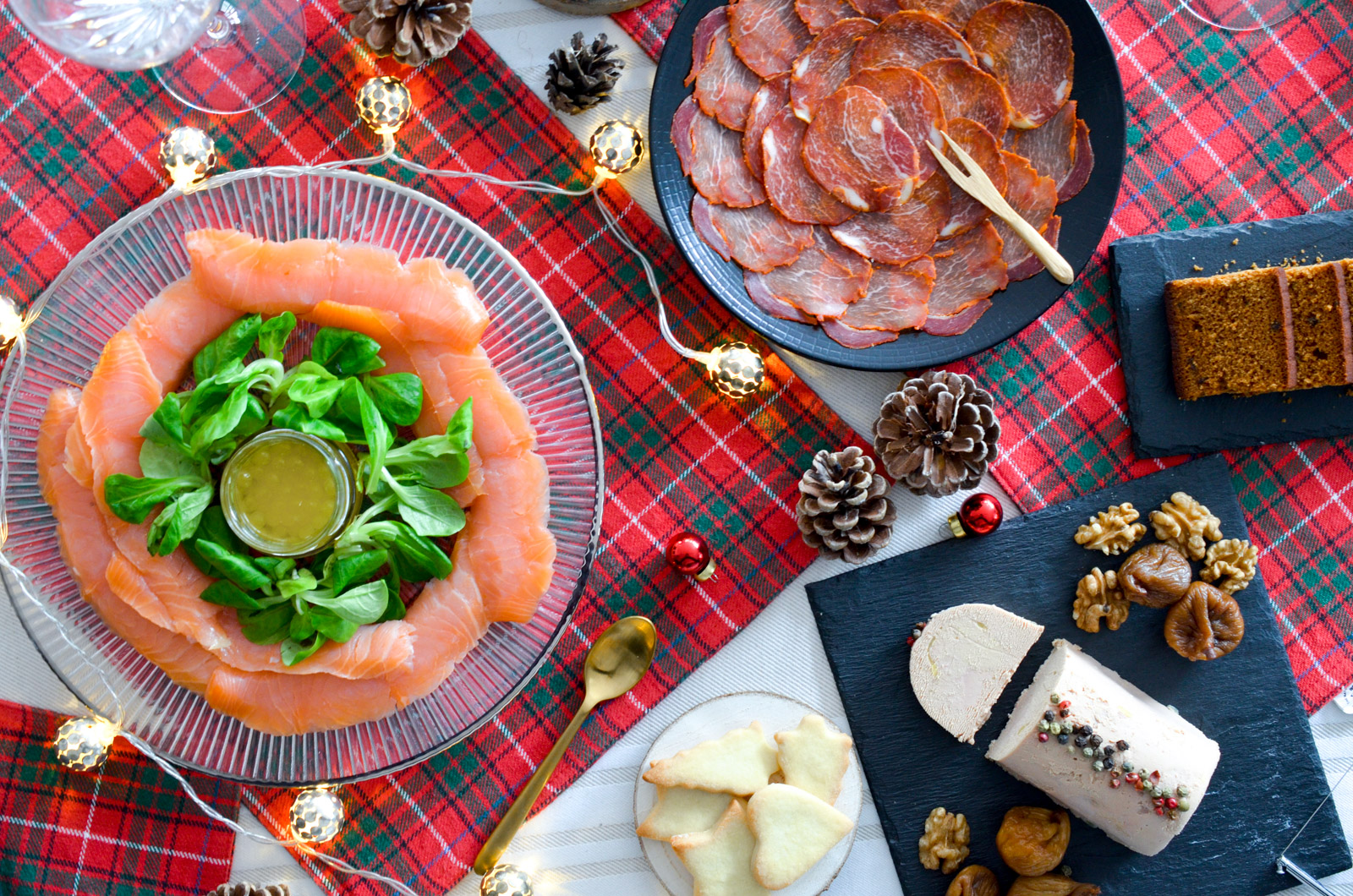 Qu’avez vous prévu pour les fêtes de fin d’année et avec qui ? De mon côté c’est Noël en famille et … Réveillon improvisé comme chaque année ! Un réveillon avec quelques amis et une table dressée sur le pouce avec les incontournables des fêtes: saumon, foie gras, petits légumes, tartinades et bien sûr champagne :-) Un petit peu comme la table que je vous propose en photo aujourd’hui. Je préfère proposer une multitude de petites assiettes de dégustation à picorer toute la soirée plutôt qu’un repas formel, à table, comme il y a déjà eu beaucoup pour fêter Noël. C’est convivial et tout le monde y trouve son compte.