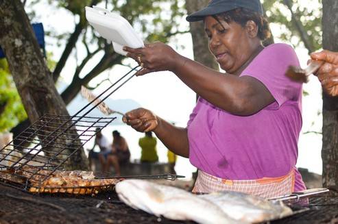 Barracuda grillé, Bourgeois, notre take-away accompagné de son jus maison de goyave, la vie est bien douce au paradis…