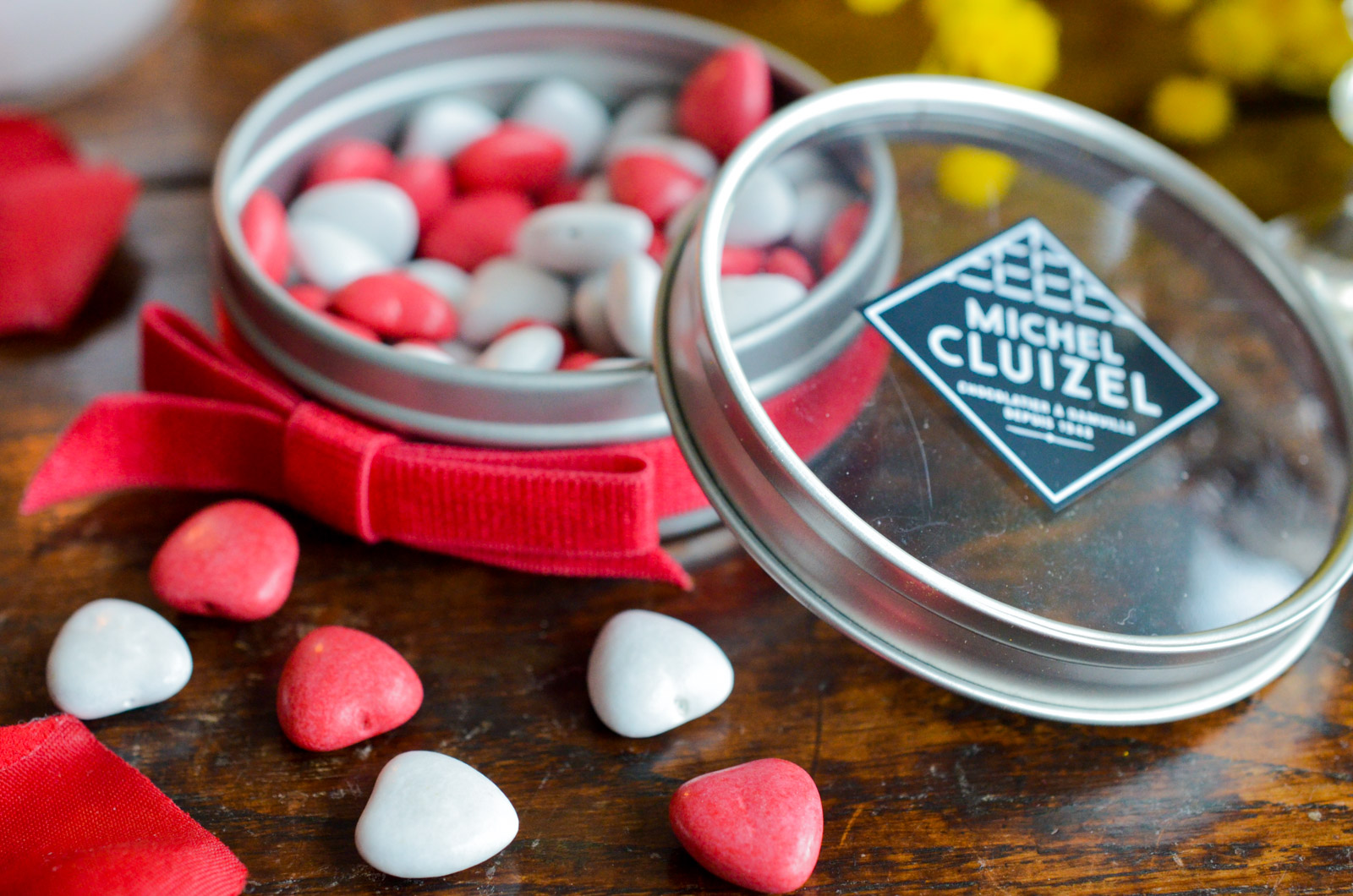 On commence avec Michel Cluizel avec leur nouvelle création: des coeurs en chocolat noir 72% enrobés d’une coque croustillante de sucre blanc et rouge. Ultra croquants et au bon goût de chocolat, ils sont délicatement disposés dans un écrin habillé d’un ruban rouge…