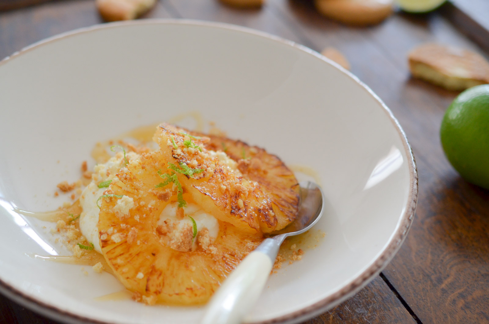 Dans vos assiettes de service, disposez une couche de crème au citron dans le fond de vos coupes. Disposez 2 tranches d’ananas grillé par assiette sur le dessus, le miel, et terminez par des brisures de biscuit. Dégustez sans plus attendre.