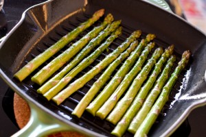 - Faites chauffer votre gril avec un filet d'huile d'olive. Lorsque la poêle est chaude, déposez vos asperges faces coupées directement sur le gril, et saisissez-les 1 à 2 minutes tout au plus. Retournez-les, continuez la cuisson 30 secondes.