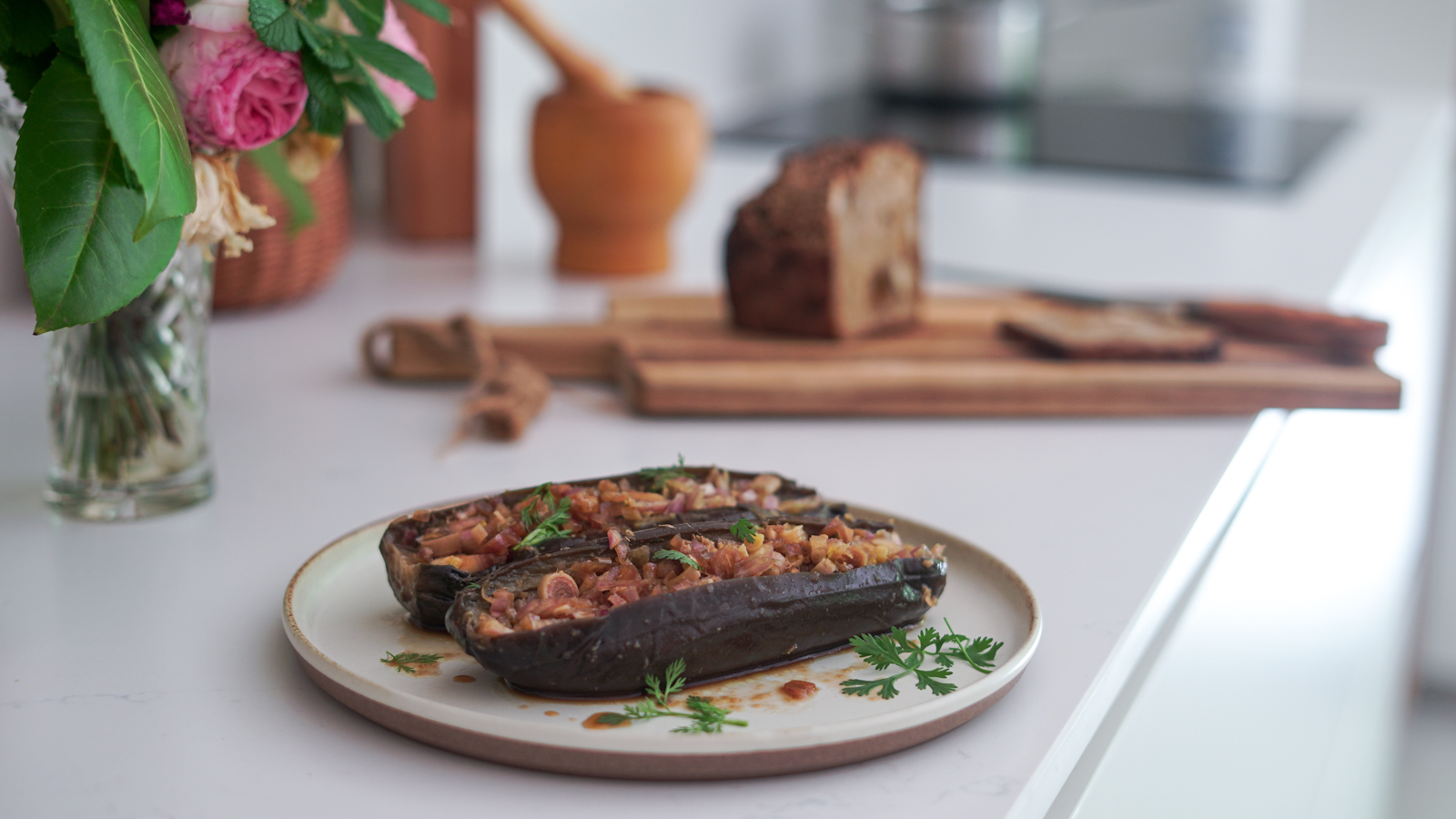 - Coupez les aubergines en deux et placez-les sur une plaque allant au four. Enfournez pour environ 40 minutes (la peau doit être ramollie, la chair encore ferme). Laissez refroidir.