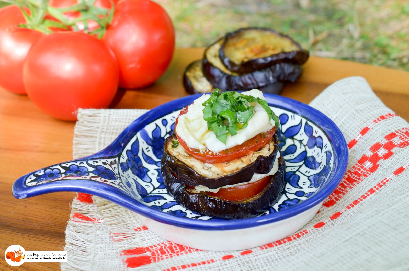 Coupez le Rocamadour en lamelles. Prenez une rondelle d’aubergine rôtie, placez dessus une rondelle de tomate, un morceau de fromage, quelques feuilles de basilic ciselé et un tour de moulin à poivre. Procédez de même sur plusieurs étages pour former un mille-feuille (je fais généralement 3 couches successives de légumes).