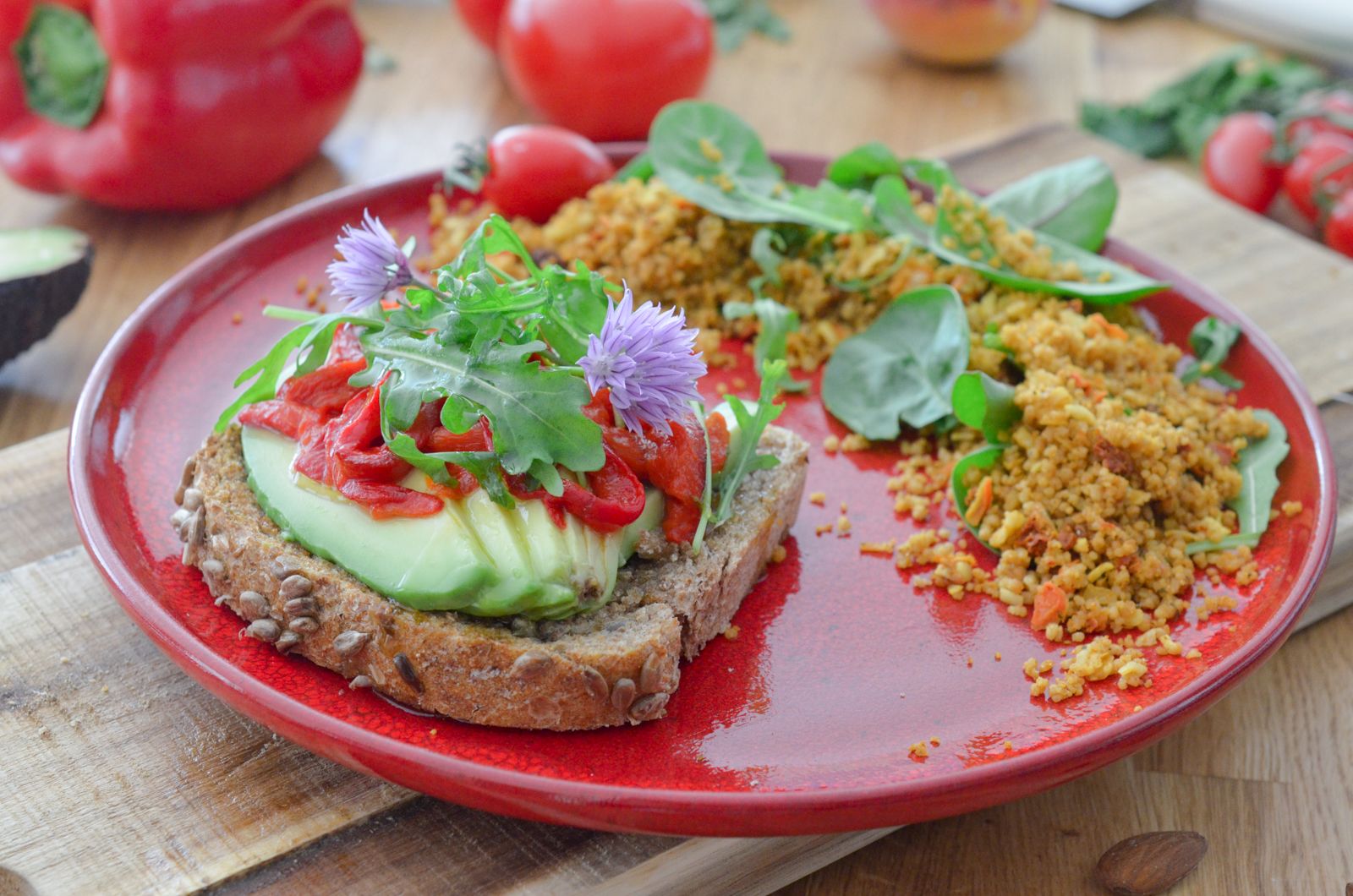 Une assiette végétarienne (et même vegan pour les adeptes), très gourmande et rassasiante. J’accompagne mes avocado toasts d’une salade de semoule d’épeautre. Une petite chose que j’ai trouvé chez Beendhi. C’est très bon, pratique, je l’ai servi ici un peu comme un taboulé, je recommande !