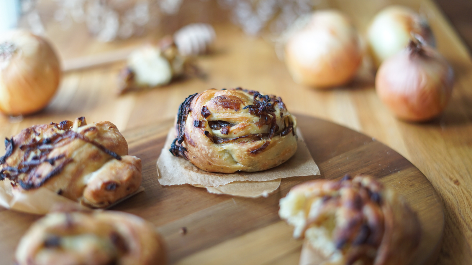 - Étalez la garniture aux oignons sur le dessus et roulez la brioche.