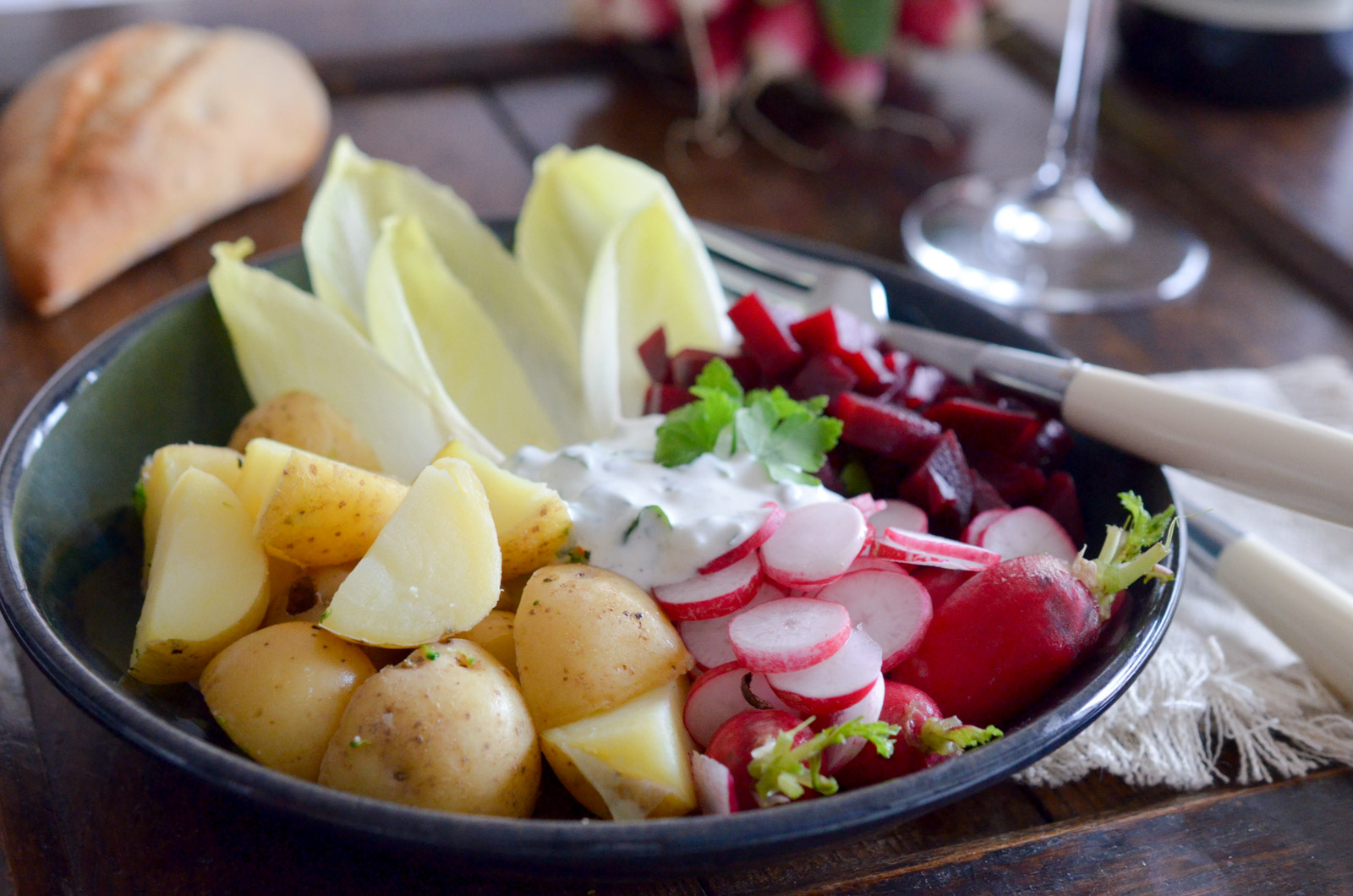Disposez dans vos bols de service un lit d’endives, les betteraves, les radis entiers et en lamelles et terminez par les pommes de terres égouttez et assaisonnées légèrement de sel et de poivre ainsi que d’un filet d’huile d’olive. Disposez quelques cuillères de crème légère au centre et dégustez sans plus attendre.