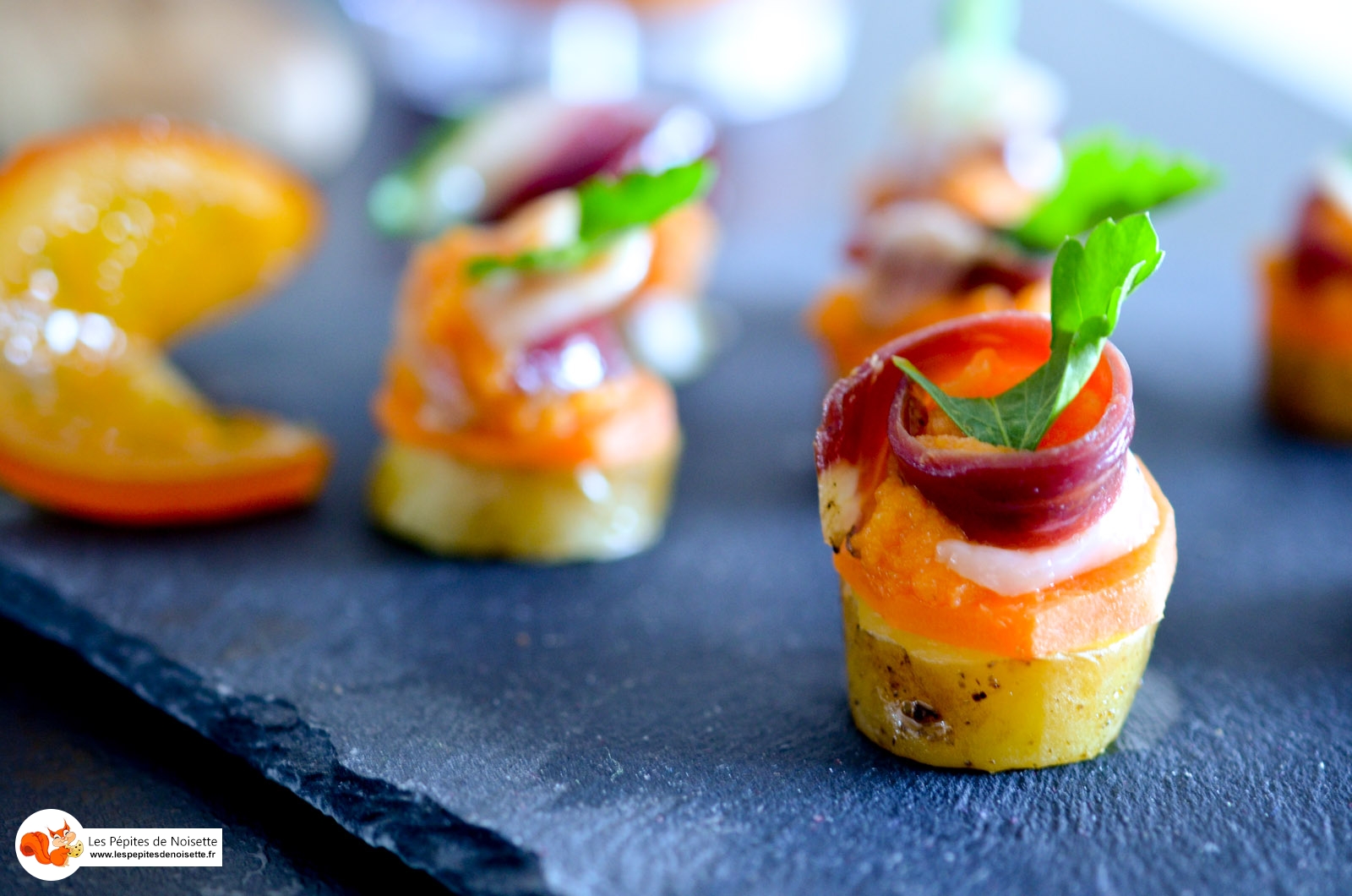 - Sur vos rondelles de pomme de terre, déposez une rondelle de carotte ainsi qu’une cuillère de crème de carottes. Déposez délicatement sur le dessus une tranche fine de magret et décorez avec une pluche de persil.
