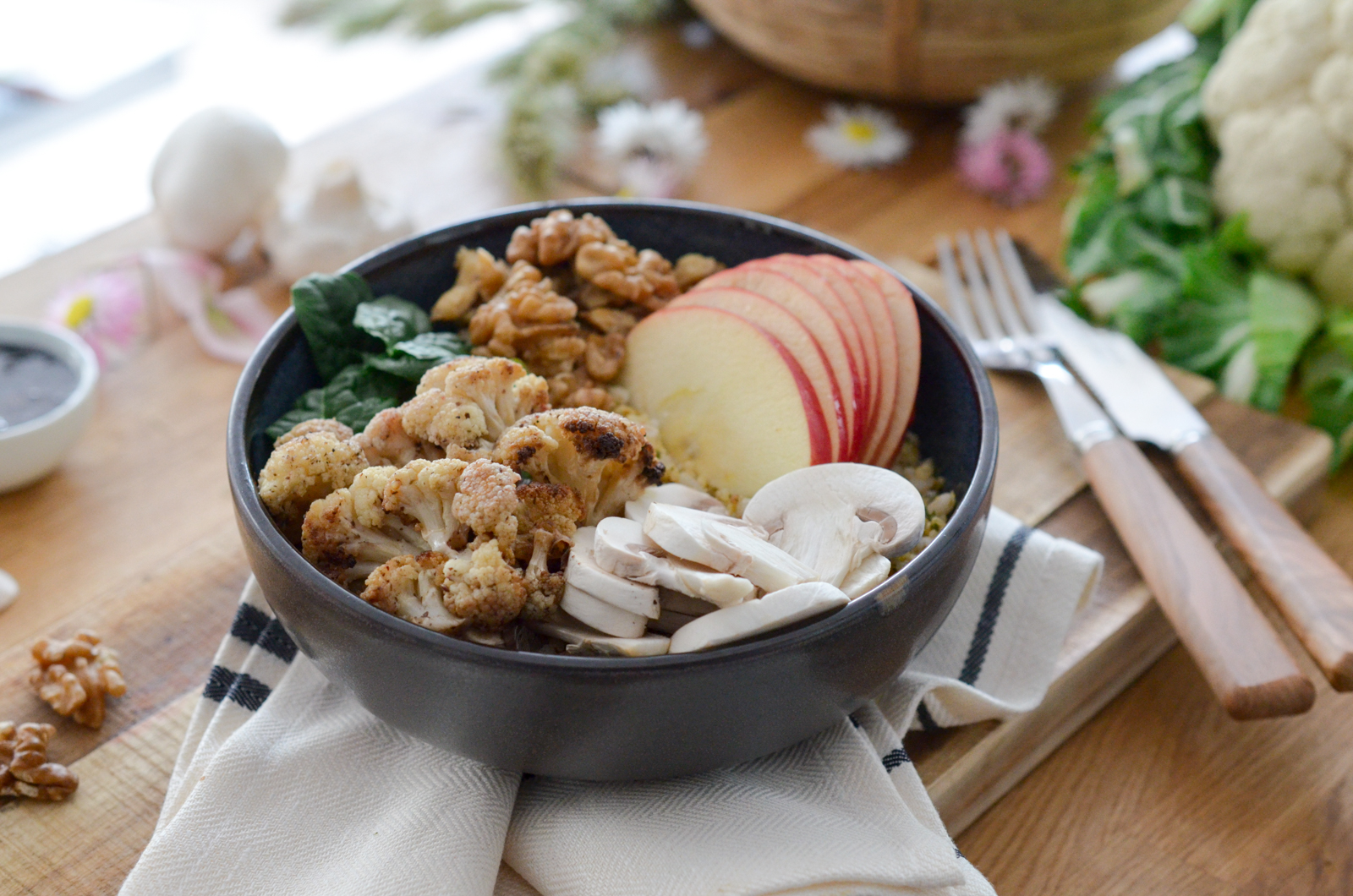 - Dressez vos bowls : disposez un lit de céréales, ajoutez sur le dessus le chou-fleur, les pommes, les champignons, les noix, les pousses d’épinard et terminez en arrosant généreusement de vinaigrette.