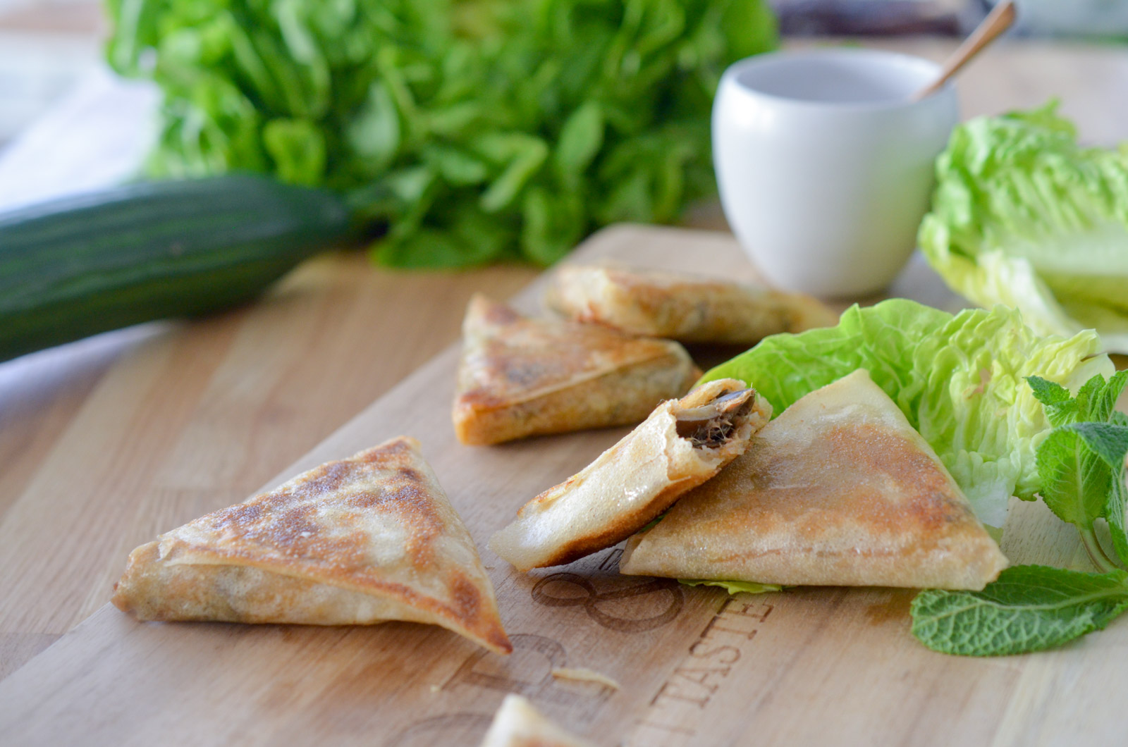 J’ai formé ici des triangles croustillants (comme des samoussas), mais vous pouvez aussi bien les rouler sous forme de nems ou d’aumônières.