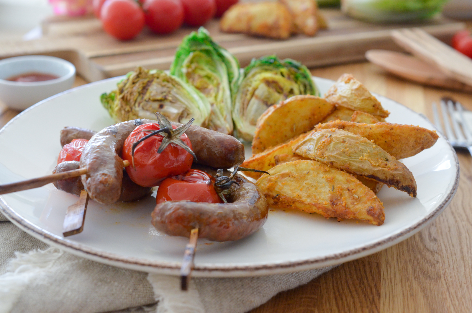 Pour accompagner ces brochettes, je vous propose des potatoes maison et des sucrines grillées. Il ne manque plus qu’à aller chercher vos sauces préférées et hop le tour est joué : en cuisine!