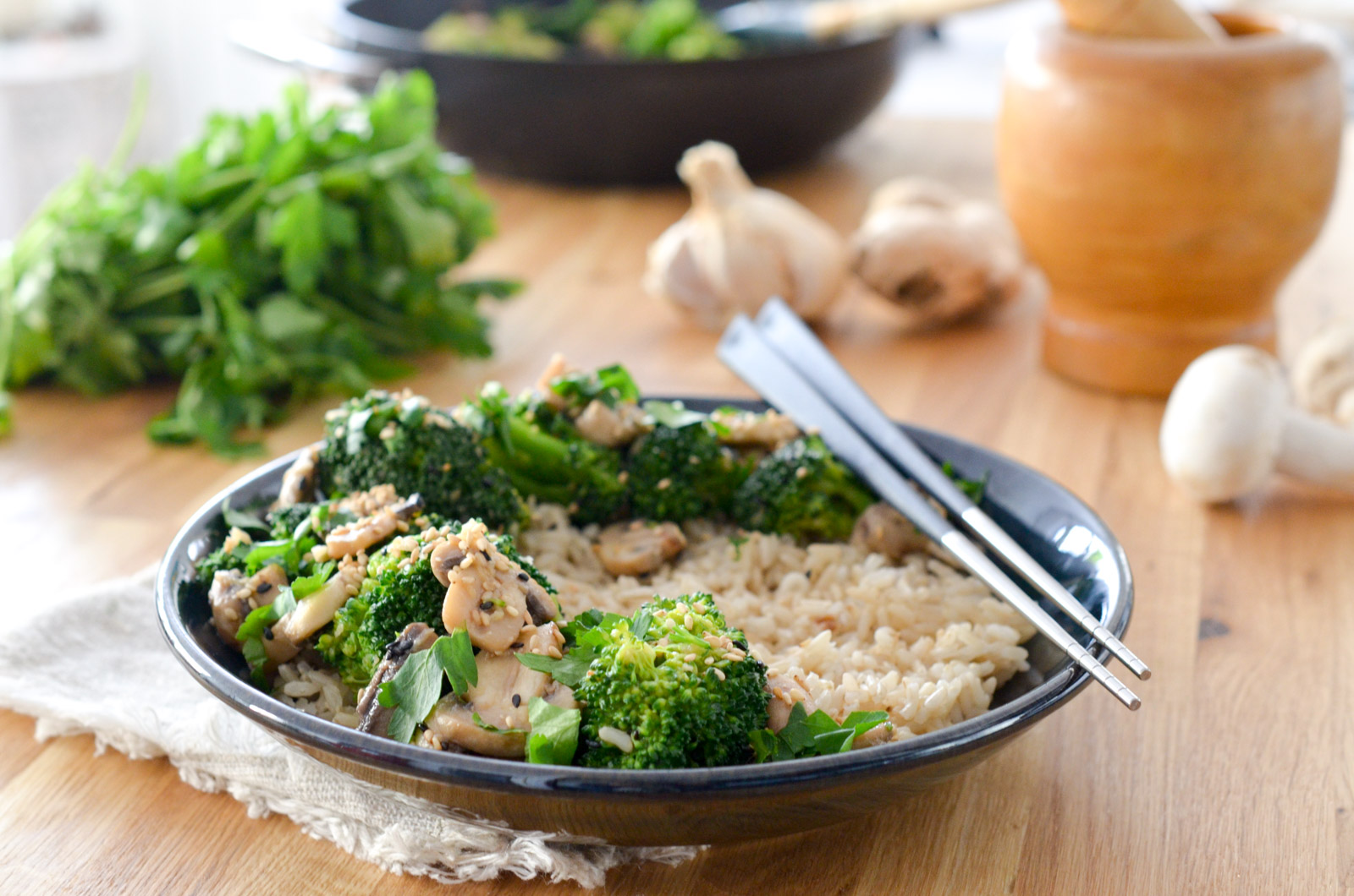 Quelques fleurettes de brocoli, des champignons, un peu de riz et une sauce minute à base de miso et de sauce soja suffisent à sublimer en un coup de baguette magique cette recette expresse.