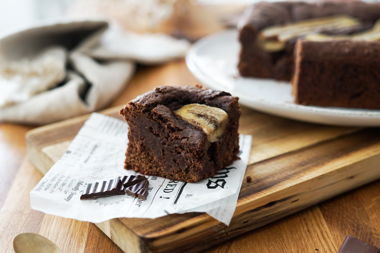 En ce moment, j’ai comme une envie de réconfort (boulot intense et vie active oblige!). Il paraît que c’est tendance cette envie de réconfort, on nomme ça le « comfort food » (oui, cela à un nom!). Tant mieux, voici une recette de brownie à la banane… tout simplement parce que j’aime ça et qu’il y a un petit côté addictif auquel on ne peut résister: on en prend un bout, on en veut encore. Un brownie double texture, fondant à souhait, avec des pépites de chocolat croquant: que demander de mieux?