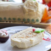 - Transposez sur une assiette et coupez les extrémités légèrement en biais. Ces "chutes" de biscuits vous serviront à faire les nœuds de votre bûche (cf. photo: ce sont comme de grosses branches coupées pour imiter le bois).