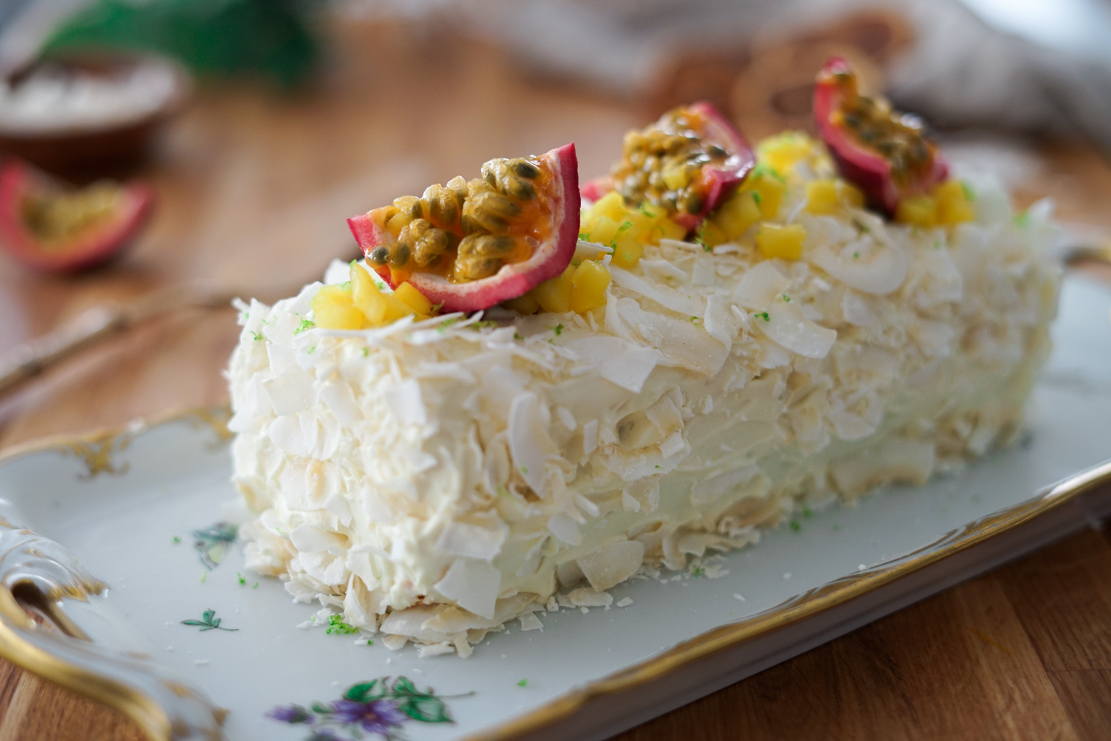Chaque année c’est la tradition, préparez la bûche de Noël en famille. Pour changer un peu de la traditionnelle bûche au chocolat ou encore de la crème au beurre, je vous propose ici une bûche exotique au fruit de la passion, mangue et coco. Un dessert fruité, agréable et plein de saveurs !