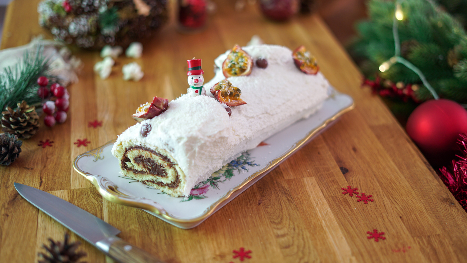 Cette année, j’ai choisi de vous proposer une bûche chocolat passion ! La passion est un fruit que j’adore et qui amène beaucoup de fraicheur à de nombreux plats. L’idée ici est de préparer un biscuit roulé tout simple et de le garnir d’une ganache chocolat passion avec un petit sirop d’imbibage maison qui vous garantira un moelleux incomparable. Côté déco, misez sur la simplicité : ici une chantilly coco pour imiter la neige.