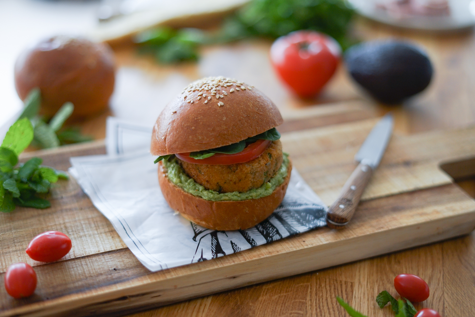 - Coupez les buns en deux et faites-les légèrement toasté. Tartinez d’avocat, déposez un steak de thon, une rondelle de tomate, un peu de salade, pressez fermement avec le dessus du bun et dégustez immédiatement.
