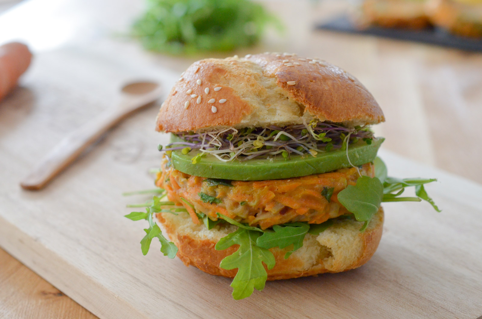 Un burger végétarien sans steak de lentilles, ni de soja, ni de pois pois chiches voire de quinoa (qui sont tous assez longs à préparer) c’est possible! Voici le burger carottes à la thaï dans laquelle j’ai préparé des « steaks » végétariens 100% carotte, complété par une garniture simple et savoureuse: une mayonnaise épicée, quelques morceaux d’avocat et une touche de graines germées.