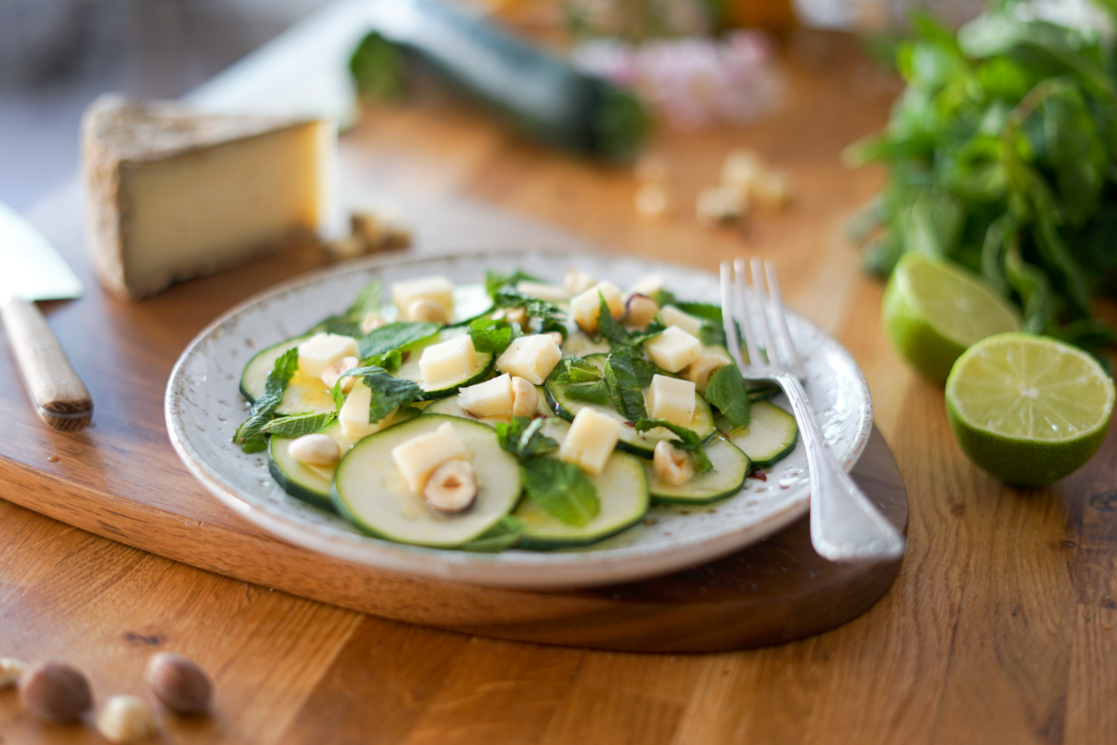 Envie d’une recette bien fraiche et gourmande, 100% de saison ? J’ai nommé le carpaccio de courgettes à la menthe. Une assiette fraiche et légère que j’ai rendue très gourmande avec l’ajout de noisettes et de Tomme. Une petite merveille assaisonnée d’une vinaigrette un peu spéciale à l’huile de noisette et au vinaigre balsamique blanc.