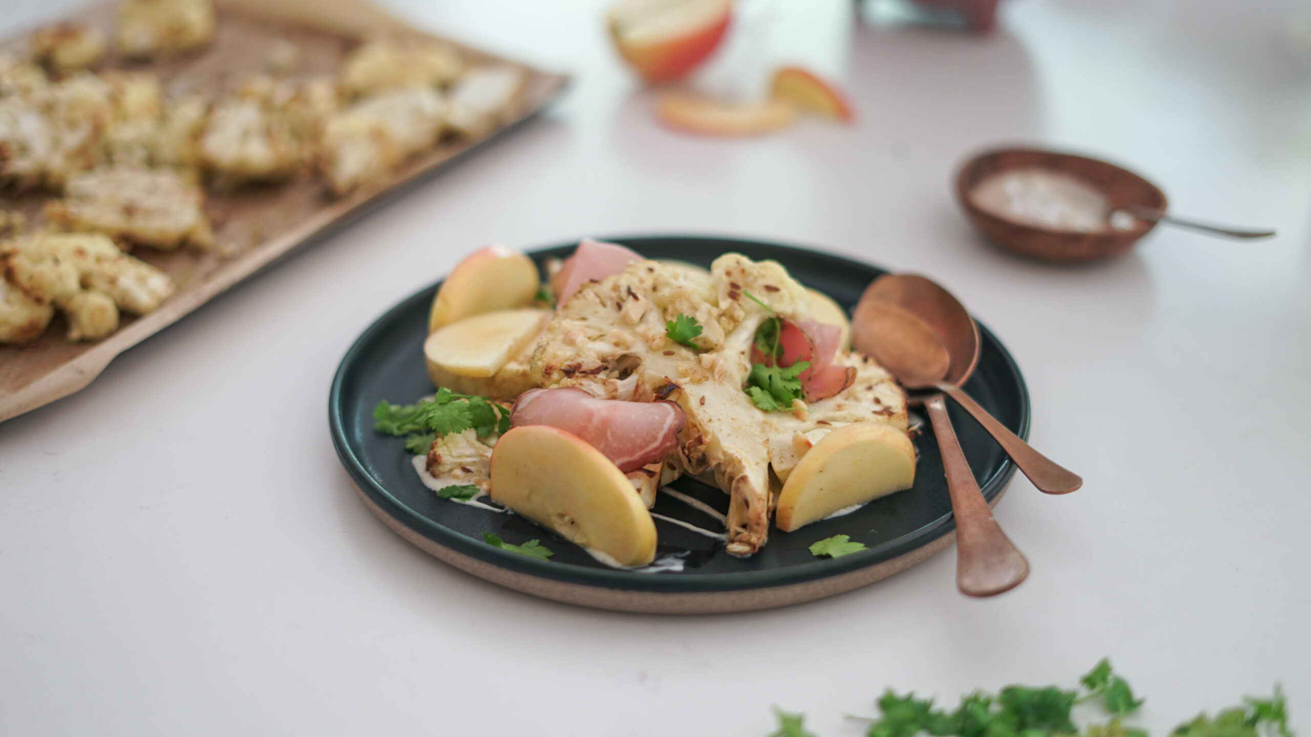 Le chou-fleur est souvent un légume que l’on prépare toujours de la même façon : en velouté ou en gratin. Mais si vous êtes en recherche d’autres idées, toutes légères et bien parfumées, voici la recette qu’il vous faut ! Un chou-fleur rôti au four avec du cumin, le tout servi avec une garniture très fraiche composée de pommes, de noisettes torréfiées et d’herbes fraiches. J’adore y déposer également quelques tranches de charcuteries, mais ça c’est à vous de voir, c’est pour la touche de gourmandise.