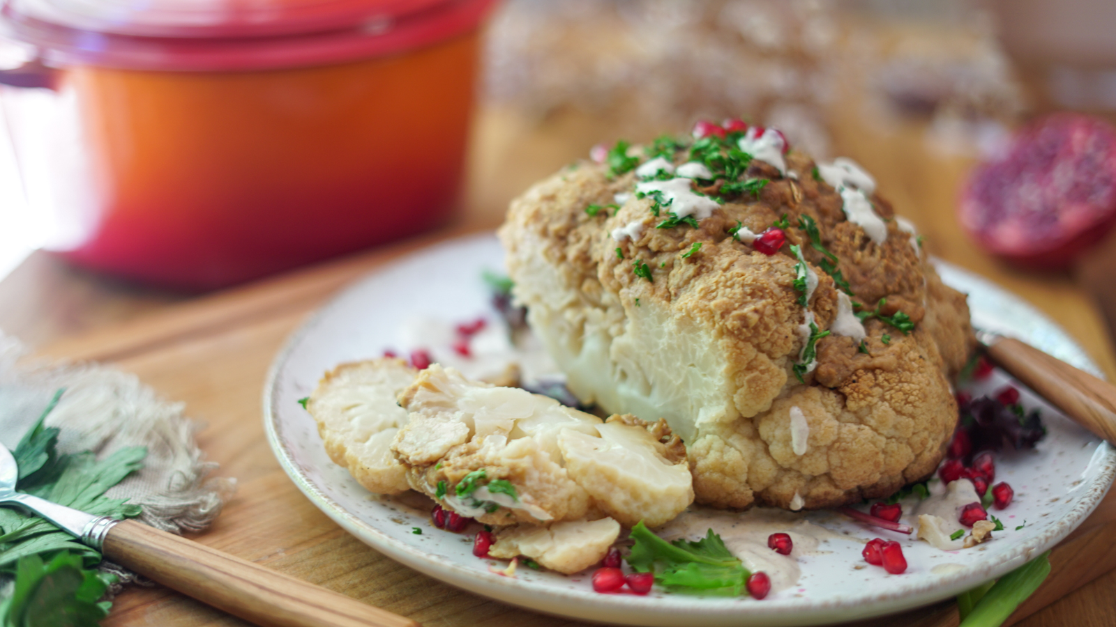 - Servez le chou-fleur tiède, entier ou découpé, avec la sauce au yaourt, les graines de grenades et du persil ciselé.