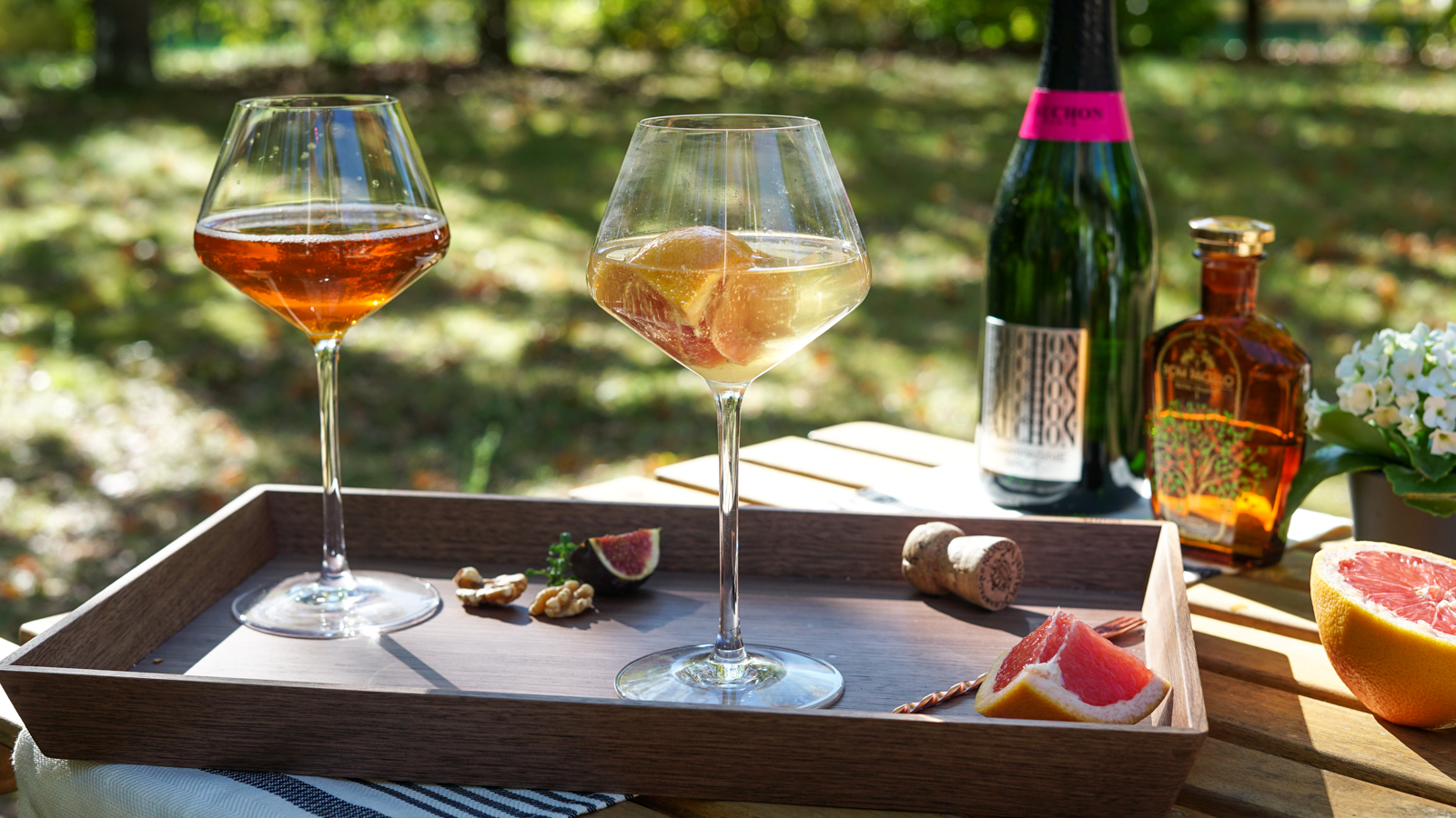 La base est un champagne (ici j’ai pris le Champagne Brut de chez Fauchon : délicieux aussi bien nature qu’en cocktail), j’y ajoute une liqueur d’orange (la Dom Pacello a un goût unique !), et un peu de pamplemousse frais. C’est tout et c’est très bon.