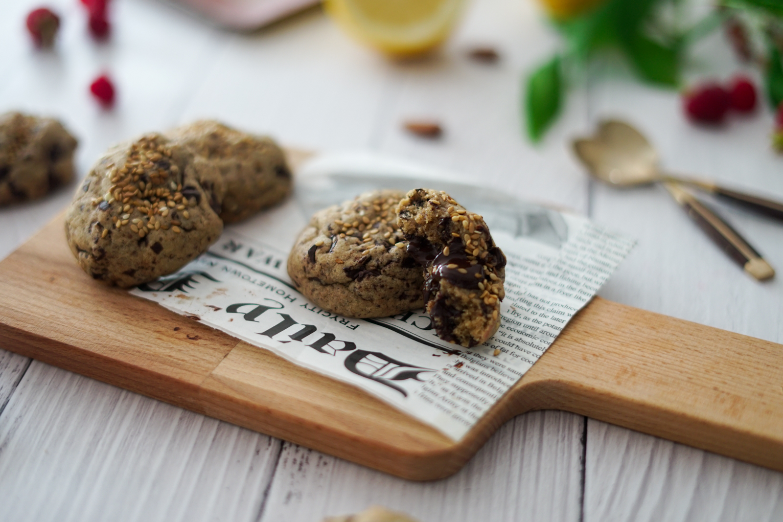 Mais aujourd’hui je ne vous partage pas ma recette mais celle signée Catherine Kugler, issue de son livre « Essentiel(s) » que j’aime beaucoup. Elle y incorpore 2 différents types de farine, ainsi qu’un peu de graines de sésame, ce qui rend les saveurs vraiment très intéressantes. Elle mélange également du beurre et de purée de noisette ce qui rend les cookies très gourmands. D’ailleurs, je vous mets le lien vers le live juste ici si vous voulez découvrir les secrets de ces cookies, que nous avons cuisinés à quatre mains avec Catherine.
