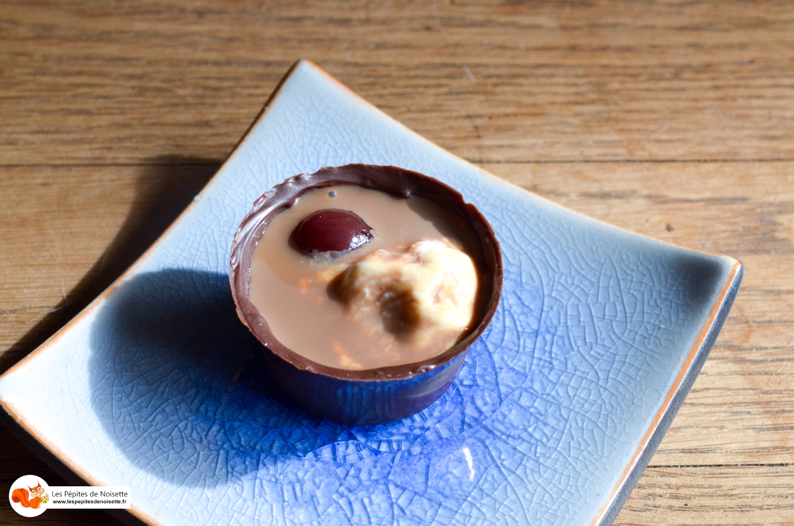 - Juste avant de servir, déposez dans chaque coque en chocolat une mini boule de glace, une cerise au kirsch, et arrosez généreusement de Baileys.