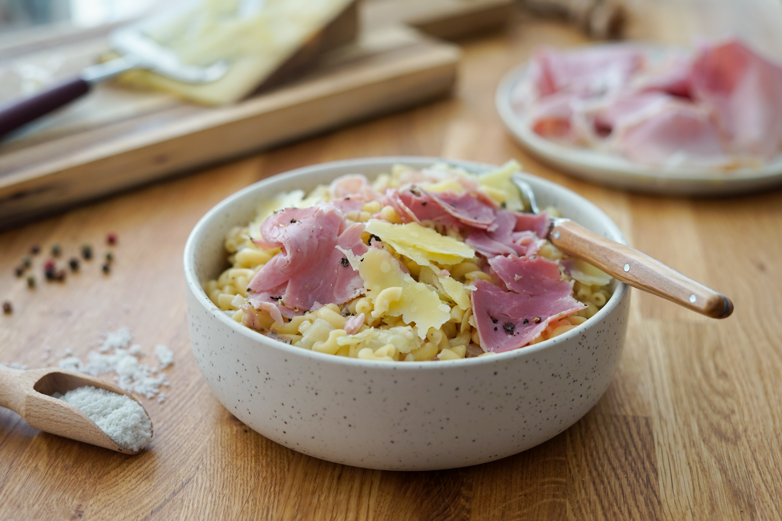 - Versez les coquillettes dans la casserole de crème au Beaufort, ajoutez les 3/4 du jambon et poursuivez la cuisson 30 secondes. Rectifiez l’assaisonnement au besoin avec une touche de sel et de poivre.