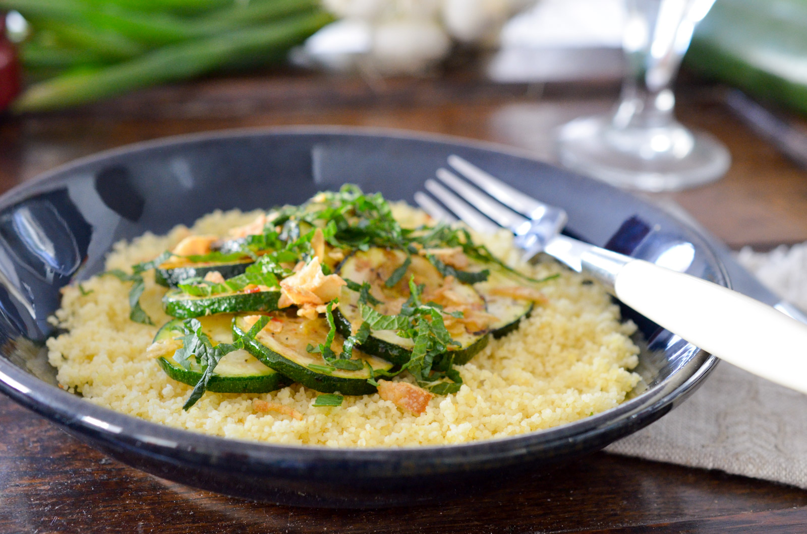 - Dans vos assiettes de service, disposez un lit de couscous égrené, ajoutez les courgettes rôties, versez une cuillère à soupe de sauce, les échalotes frites et terminez par la menthe ciselée.