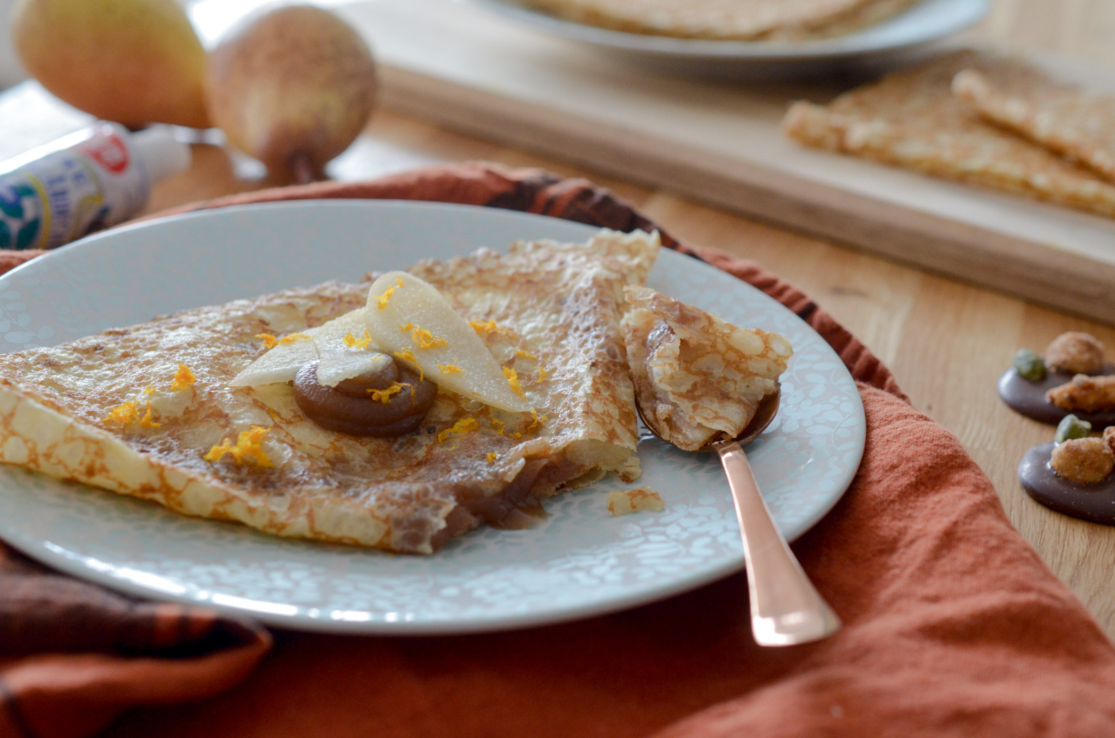 Aujourd’hui c’est LA journée des crêpes, impossible d’y échapper. Alors pour vous aider à trouver inspiration, voici une idée recette très simple et délicieusement gourmande. Une pointe de crème de marrons et quelques lamelles de poires… Une pure merveille ! Je rajoute dès fois quelques gouttes de jus de citron pour relever les saveurs et ajouter un coup de peps. Ni plus, ni moins. Belle dégustation :-)