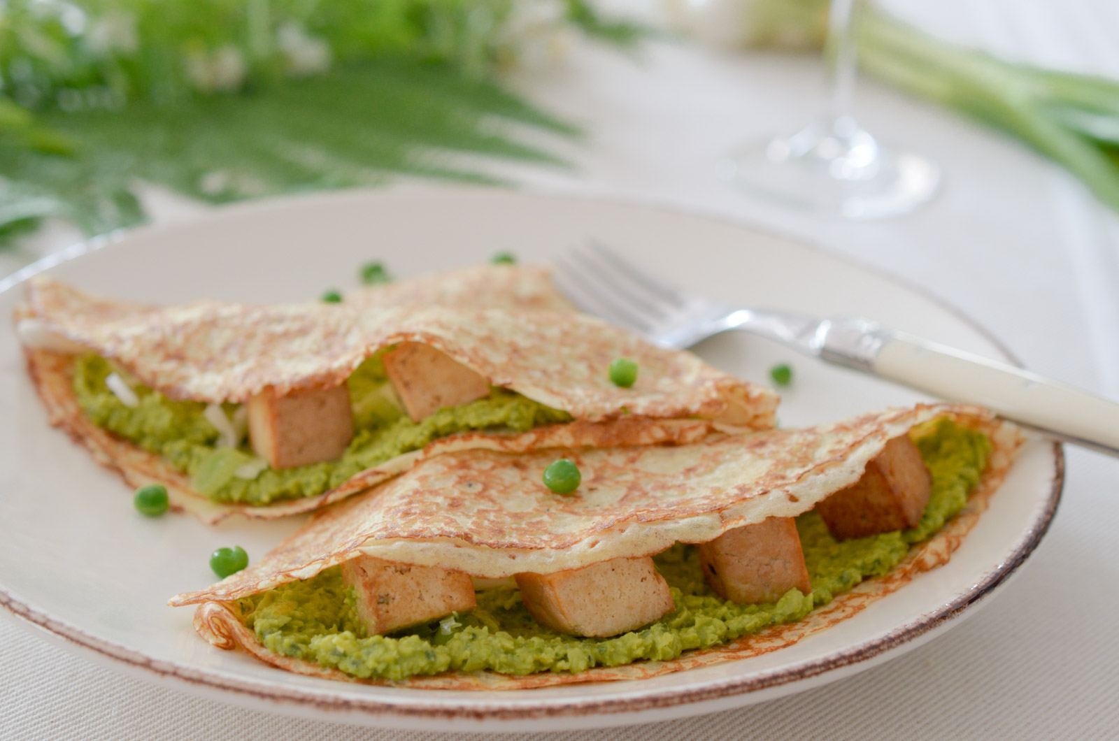 Des crêpes à la crème de petits pois et au tofu? Oui, oui, et c’est très bon ! Ne dites rien à vos invités et croyez-moi, ils sauront séduits.