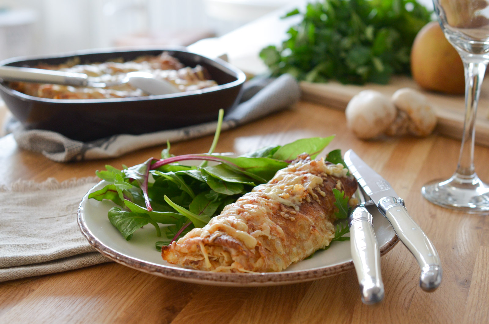 - Répartissez la préparation aux champignons sur le dessus. Roulez chaque crêpe fermement et placez-les dans un plat à gratin.
