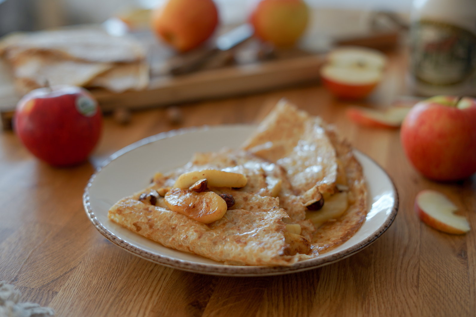 Une fois que l’on fait sauter les crêpes, reste à savoir avec quoi les fourrer. Pour changer de la classique garniture au sucre, à confiture ou au chocolat, je vous propose ma recette de crêpes aux pommes, noisettes et sirop d’érable.