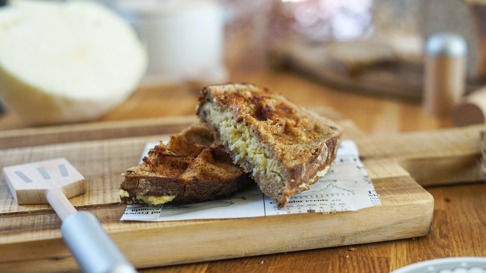 - Beurrez chaque côté extérieur du sandwich et faites griller le tout à l’aide d’un appareil à croque-monsieur (ou à la poêle ou au four si vous n’avez pas de machine).