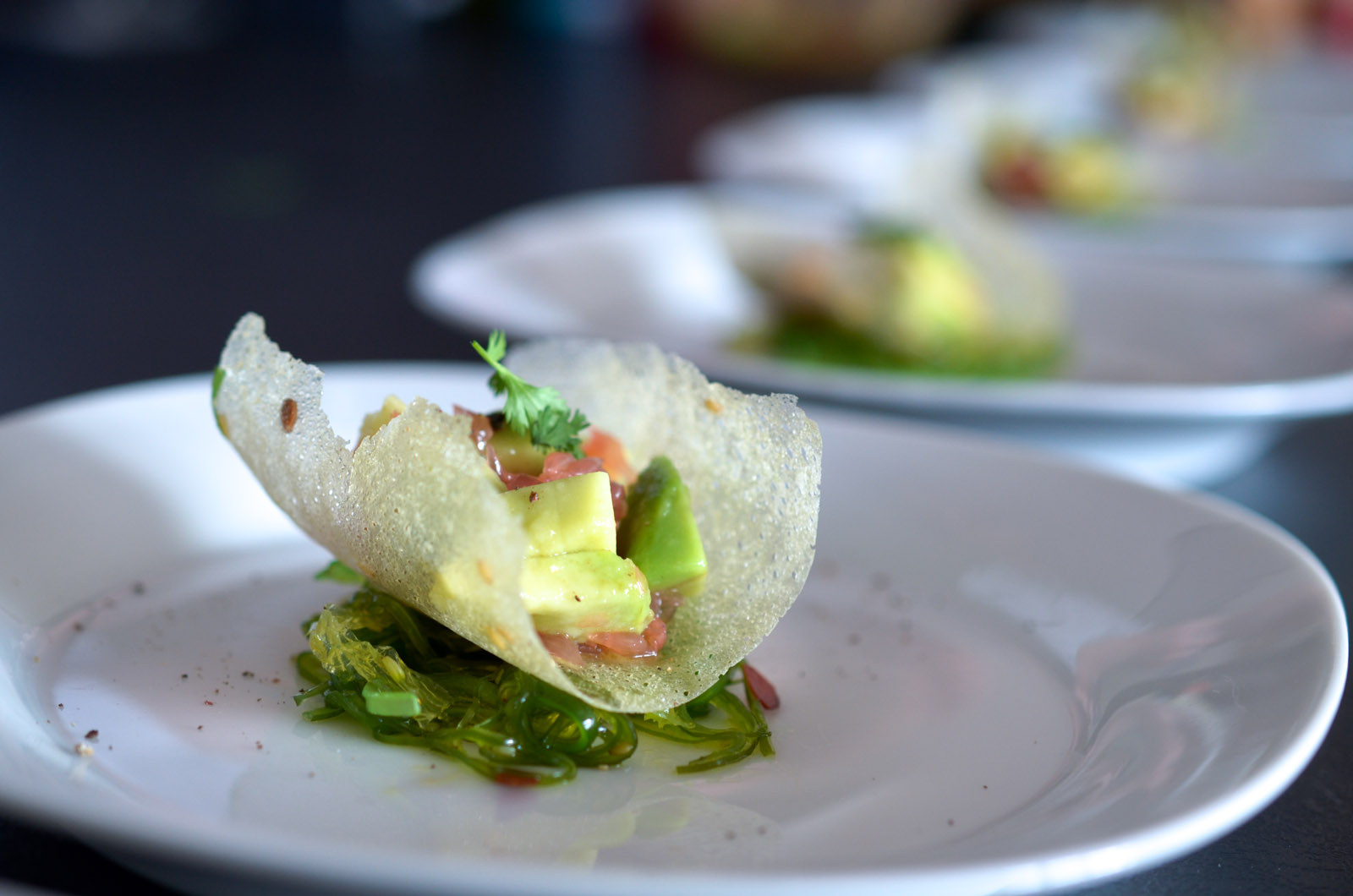 6. Sur vos assiettes de présentation, déposez un lit de salade d’algues. Posez délicatement sur le dessus un croustillant au sésame. Ajoutez ensuite une cuillère de votre tartare d’avocat.