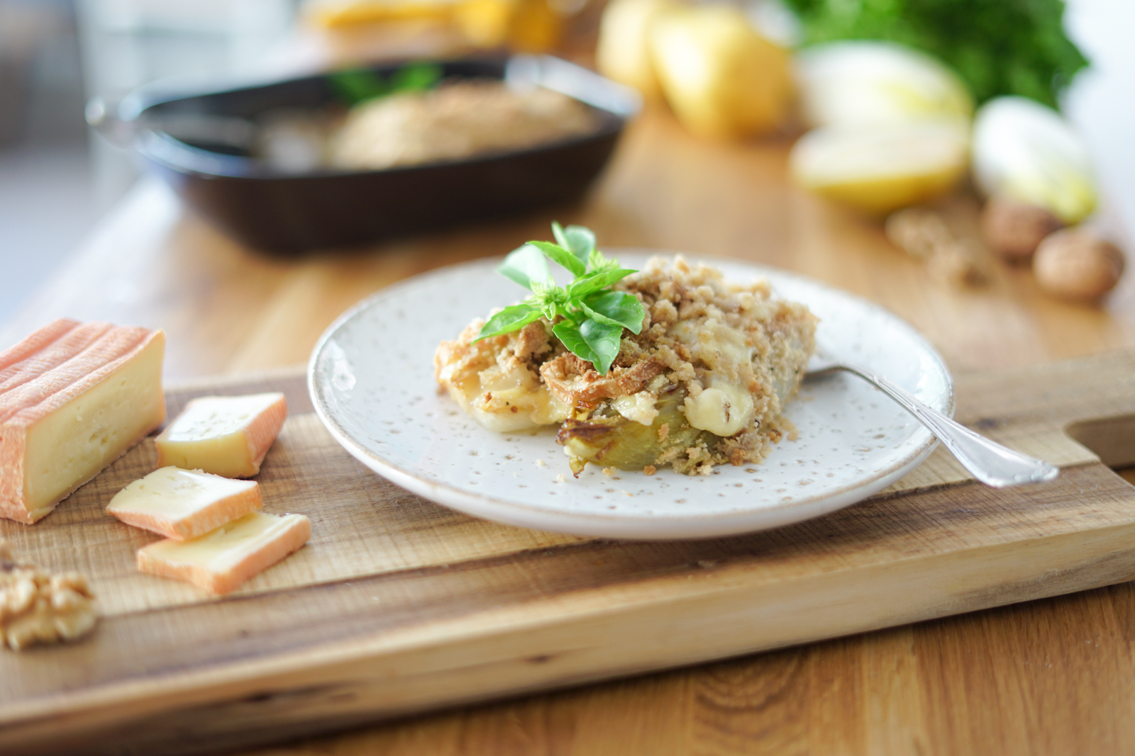 - Répartissez les endives dans un plat huilé. Ajoutez les dés de poires et recouvrez de tranches de Maroilles. Terminez en parsemant le tout de pâte à crumble.