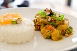 - Disposez un cercle de riz, une louche de curry d'agneau et parsemez de vos amandes (ajoutez un peu de ciboule si vous avez).