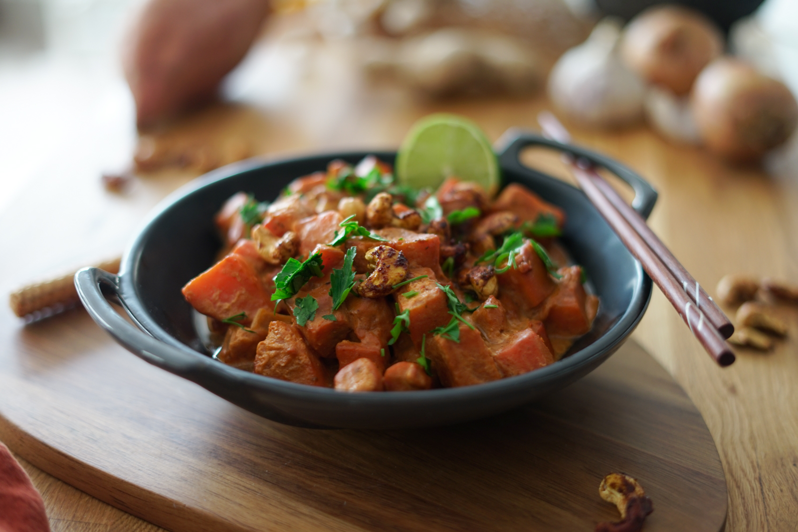 - Servez le curry de patates douces bien chaud parsemé de noix de cajou, de coriandre fraiche et de citron vert.