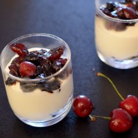 - Dans votre poêlée de cerises légèrement refroidie, rajoutez vos cerises fraîches (gardez-en quelques unes pour le décor). Répartissez la poêlée fruits dans vos verrines et décorez avec les cerises fraîches réservées.