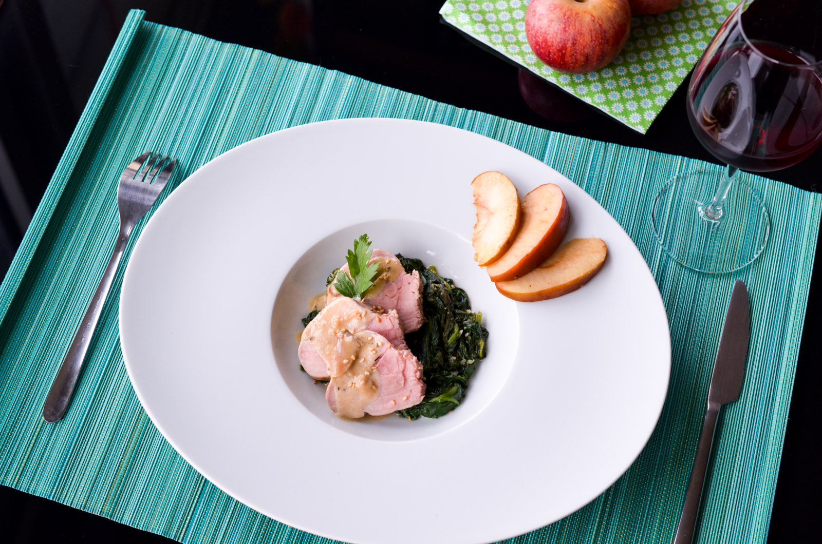 - Servez de fines tranches de porc avec les pommes et nappez de sauce.
