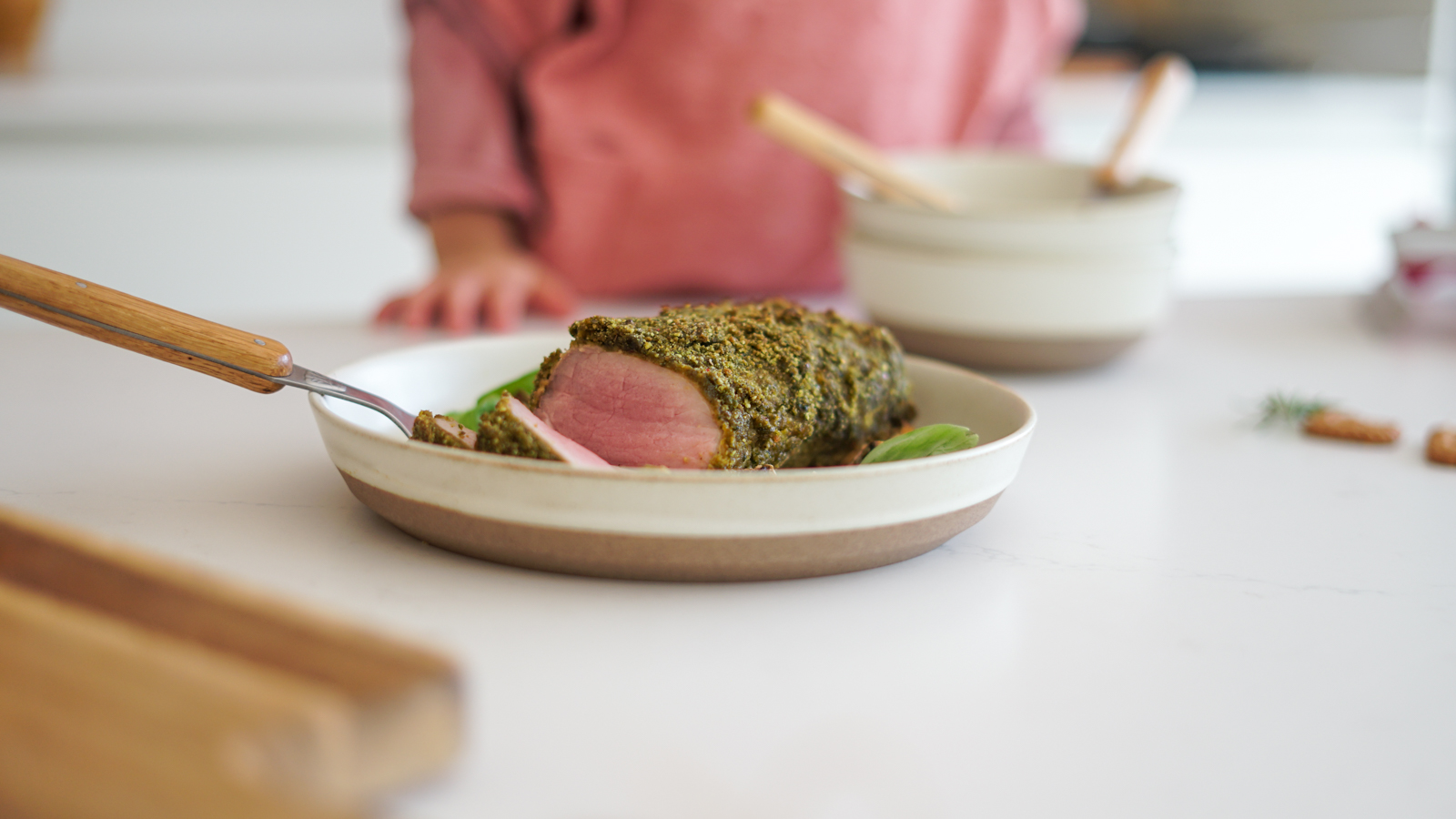 Une recette surprenante de par son titre mais vraiment délicieusement savoureuse ! Ne vous inquiétez pas, les saveurs de speculoos, d’épices, sont vraiment légères et toutes douces. Le résulat est bien équilibré et très agréable. Ce filet mignon de porc est presque confit au four, il cuit gentiment dans sa croûte de speculoos et d’herbes.