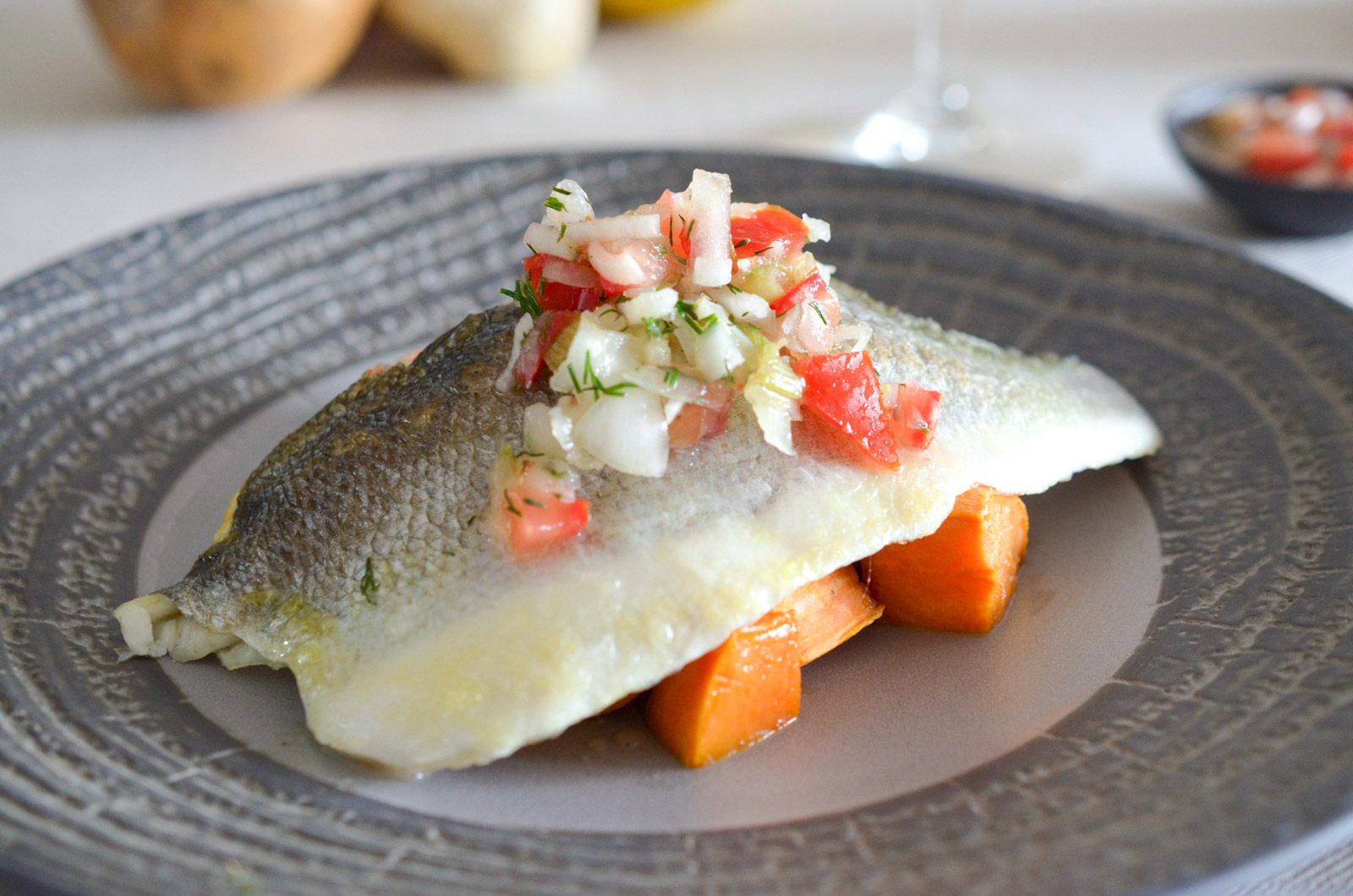 - Disposez les patates douces sur vos assiettes, ajoutez un filet de bar et terminez par la sauce chien. Dégustez immédiatement.