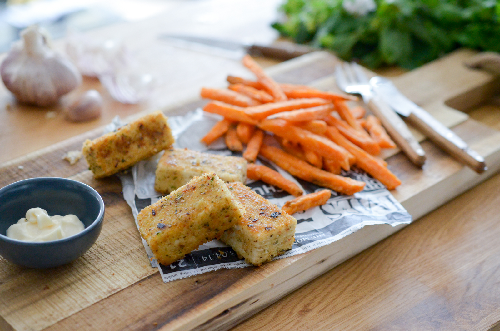 - Servez les nuggets de tofu avec les frites de patates douce et la mayonnaise végétale.