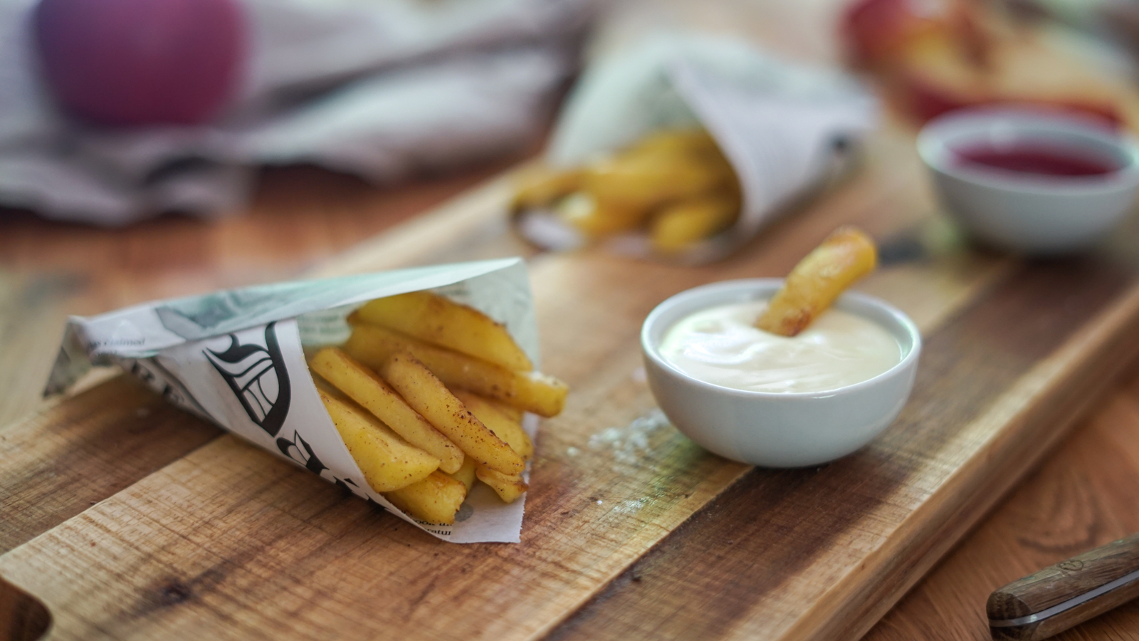 - Disposez les frites de pommes dans un petit ramequin et servez immédiatement avec la « mayonnaise » au chocolat blanc et le « ketchup » de fruits rouges.