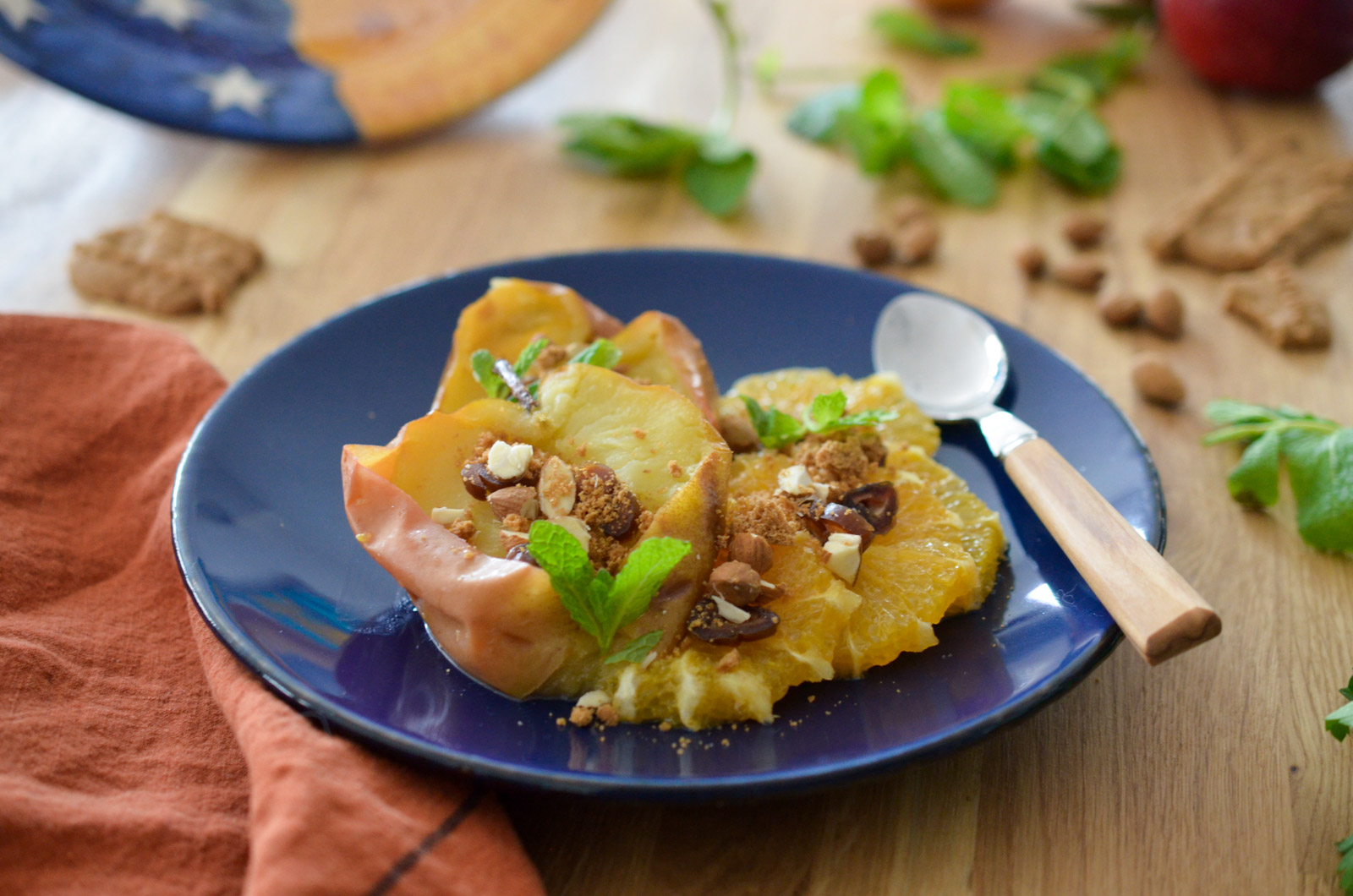 Servez les fruits rôtis sur votre carpaccio d’oranges en parsemant le tout de votre mélange croquant.