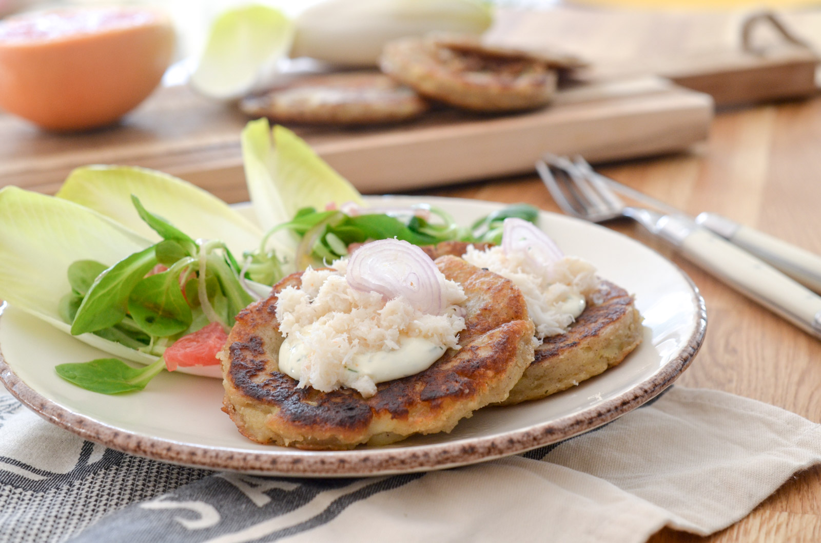- Servez les galettes de pommes de terre avec une cuillère de crème, la chair de crabe, le tout accompagné de votre salade d’endives.