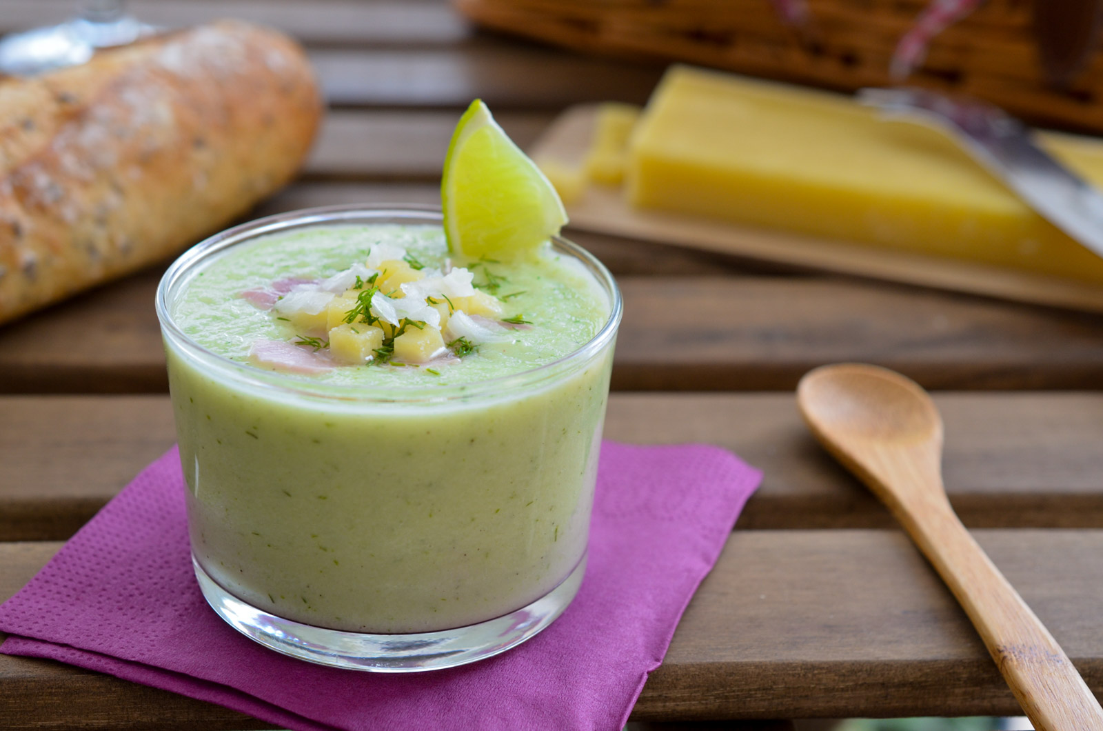 Fêtons les beaux jours avec une recette fraiche et légère: le gaspacho. Ici un gaspacho de concombre au yaourt avec lequel je me suis amusée en rajoutant un « topping » jambon – fromage plein de saveurs. Ce n’est autre qu’une chiffonnade de jambon avec quelques dés de Grand Basque (une Tomme de vache bien goûteuse), quelques oignons nouveaux et une touche d’aneth. Parfois, il n’en faut pas plus pour réveiller un plat !
