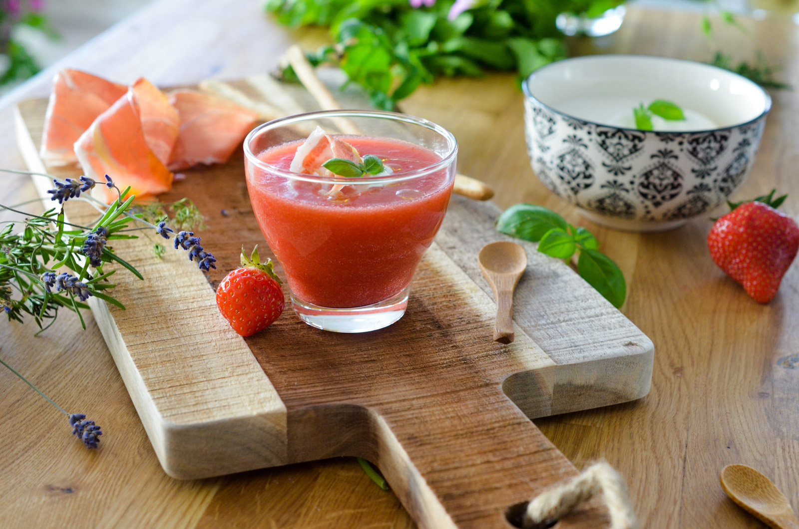 Servir bien frais décoré d’une touche de burrata, de feuilles de basilic, de fraises fraiches et d’une moitié de tranche de jambon cru en chiffonnade. Terminez avec quelques gouttes d’une bonne huile d’olive fruitée.
