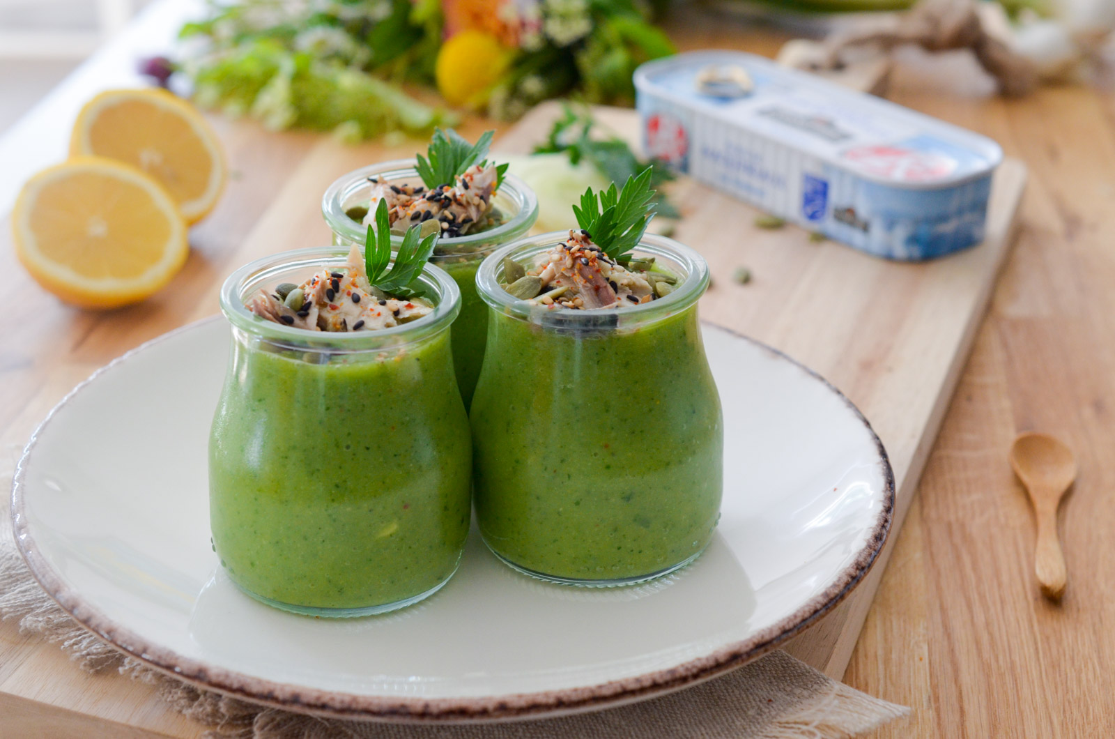 Les gaspachos on les prépare à toutes les couleurs et toutes les saveurs. La preuve, je vous propose ici une très belle recette pleine de légumes et d’herbes fraiches avec une touche asiatique. J’y ajoute en dernière minute un petit « granola » maison à base de graines de maquereaux Connétable qui apporte un peu de texture et un complément de saveurs intéressant avec la chair moelleuse et généreuse des filets de poisson au naturel.